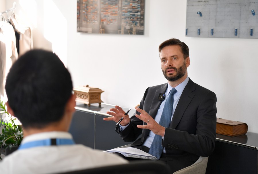 World Trade Organization (WTO) chief economist Ralph Ossa speaks during an interview with Xinhua at the WTO headquarters in Geneva, Switzerland, Sept. 12, 2023. (Xinhua/Lian Yi)