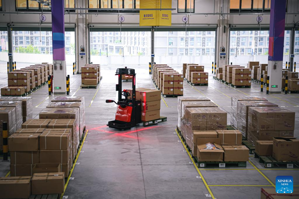 The unmanned forklift carry materials at the 19th Asian Games Hangzhou Logistics Center in Hangzhou, east China's Zhejiang Province, Sept. 13, 2023. At present, the 19th Asian Games Hangzhou Logistics Center has entered the peak stage of Asian Games material transportation. Since September, the logistics center of the 19th Asian Games Hangzhou has received and dispatched more than 10,000 pieces of materials per day. (Xinhua/Jiang Han)