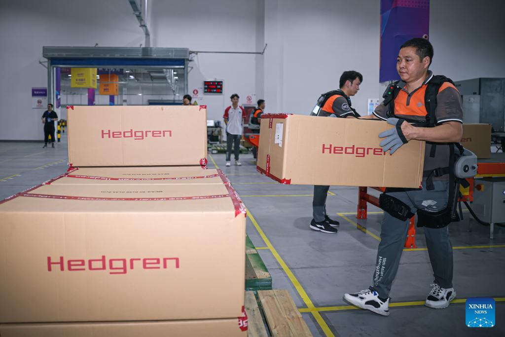 Workers equipped with exoskeletons carry a batch of Asian Games materials ready to be put into storage at the 19th Asian Games Hangzhou Logistics Center in Hangzhou, east China's Zhejiang Province, Sept. 13, 2023. At present, the 19th Asian Games Hangzhou Logistics Center has entered the peak stage of Asian Games material transportation. Since September, the logistics center of the 19th Asian Games Hangzhou has received and dispatched more than 10,000 pieces of materials per day. (Xinhua/Jiang Han)