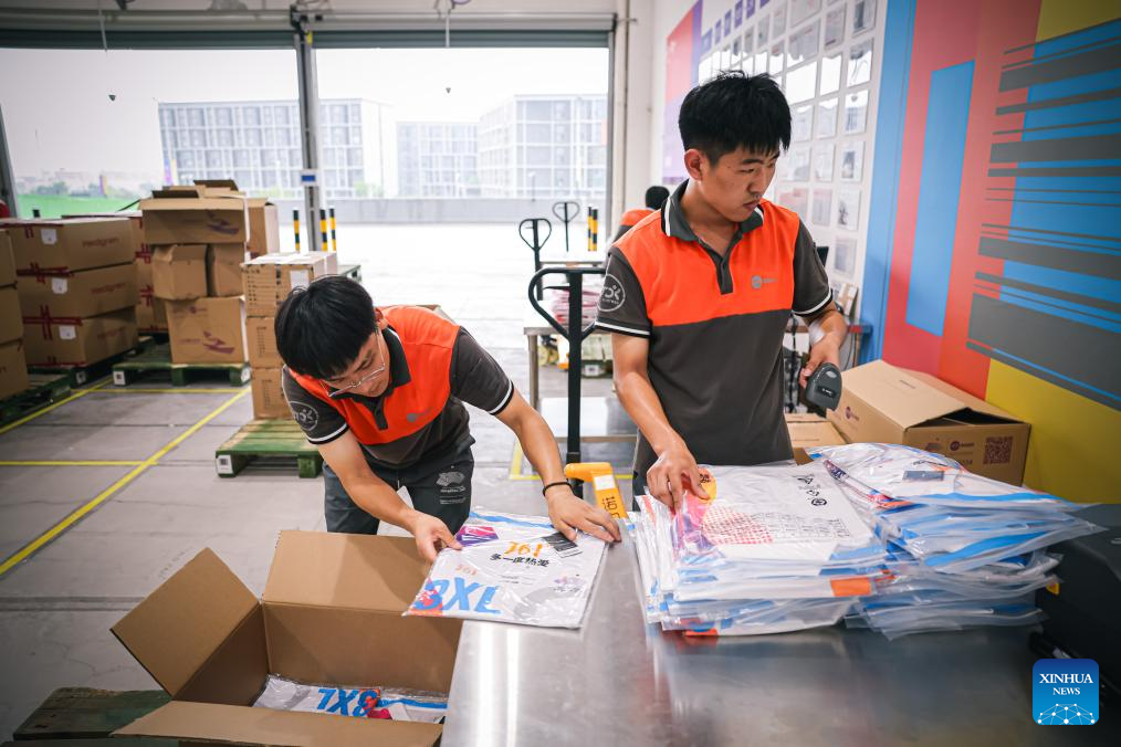 Staff members pack the materials for delivery at the 19th Asian Games Hangzhou Logistics Center in Hangzhou, east China's Zhejiang Province, Sept. 13, 2023. At present, the 19th Asian Games Hangzhou Logistics Center has entered the peak stage of Asian Games material transportation. Since September, the logistics center of the 19th Asian Games Hangzhou has received and dispatched more than 10,000 pieces of materials per day. (Xinhua/Jiang Han)
