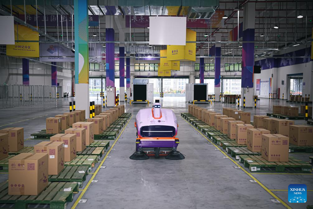 The unmanned sweeper works at the 19th Asian Games Hangzhou Logistics Center in Hangzhou, east China's Zhejiang Province, Sept. 13, 2023. At present, the 19th Asian Games Hangzhou Logistics Center has entered the peak stage of Asian Games material transportation. Since September, the logistics center of the 19th Asian Games Hangzhou has received and dispatched more than 10,000 pieces of materials per day. (Xinhua/Jiang Han)
