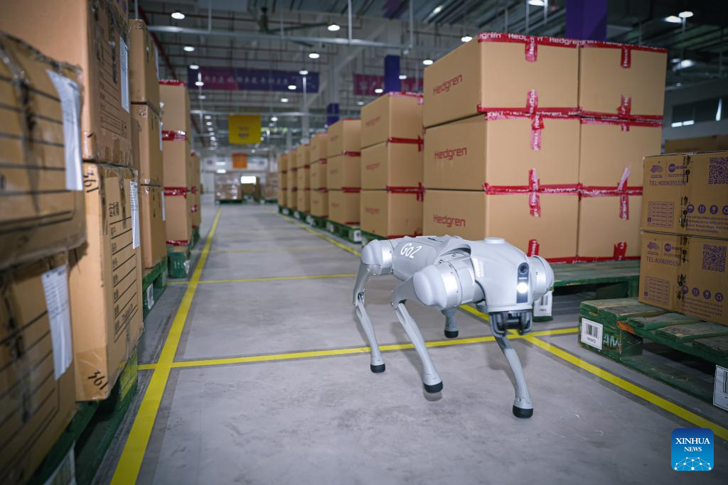 The robot dog carries out a patrol at the 19th Asian Games Hangzhou Logistics Center in Hangzhou, east China's Zhejiang Province, Sept. 13, 2023. At present, the 19th Asian Games Hangzhou Logistics Center has entered the peak stage of Asian Games material transportation. Since September, the logistics center of the 19th Asian Games Hangzhou has received and dispatched more than 10,000 pieces of materials per day. (Xinhua/Jiang Han)