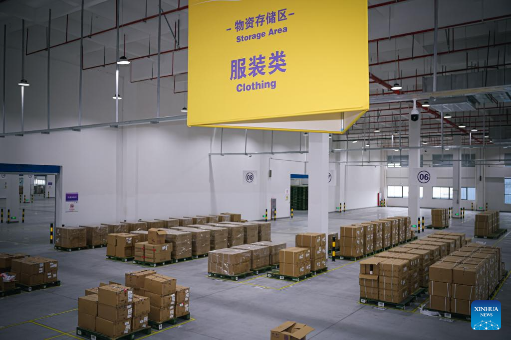 This photo taken on Sept. 13, 2023 shows the interior scene of the 19th Asian Games Hangzhou Logistics Center in Hangzhou, east China's Zhejiang Province. At present, the 19th Asian Games Hangzhou Logistics Center has entered the peak stage of Asian Games material transportation. Since September, the logistics center of the 19th Asian Games Hangzhou has received and dispatched more than 10,000 pieces of materials per day. (Xinhua/Jiang Han)