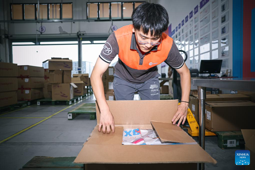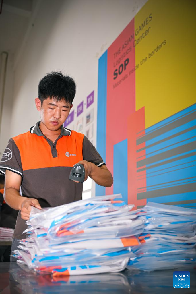 A staff member packs the materials for delivery at the 19th Asian Games Hangzhou Logistics Center in Hangzhou, east China's Zhejiang Province, Sept. 13, 2023. At present, the 19th Asian Games Hangzhou Logistics Center has entered the peak stage of Asian Games material transportation. Since September, the logistics center of the 19th Asian Games Hangzhou has received and dispatched more than 10,000 pieces of materials per day. (Xinhua/Jiang Han)