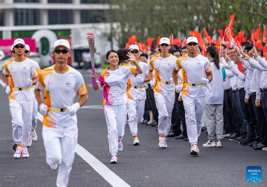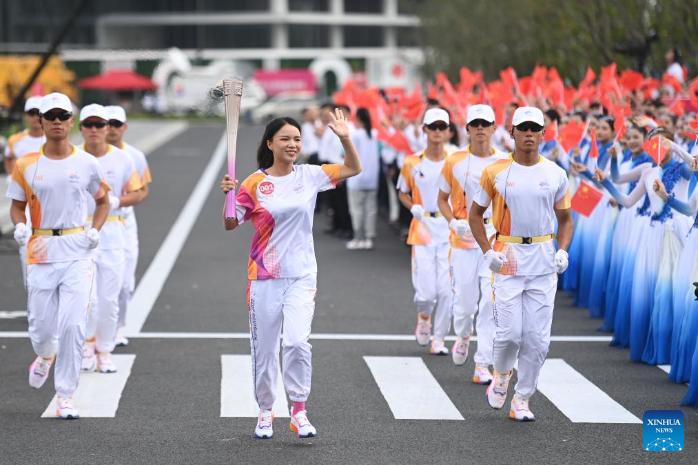 Torch bearer Yang Wenjie runs with the torch during the torch relay of the 19th Asian Games in Taizhou, east China's Zhejiang Province, Sept. 14, 2023. (Xinhua/Huang Zongzhi)