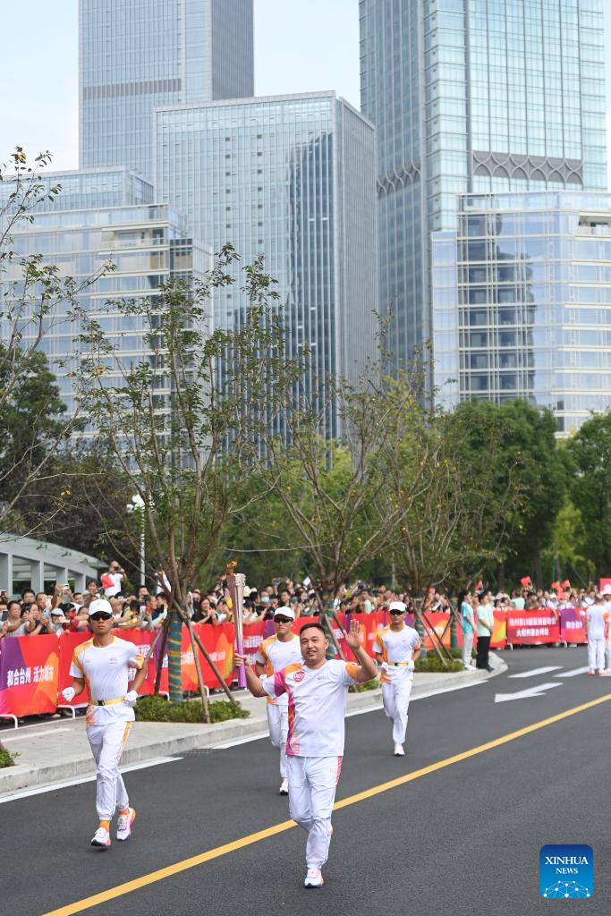 Photo taken on Sept. 14, 2023 shows the beginning ceremony of the torch relay of the 19th Asian Games in Taizhou, east China's Zhejiang Province. (Xinhua/Sun Fei)