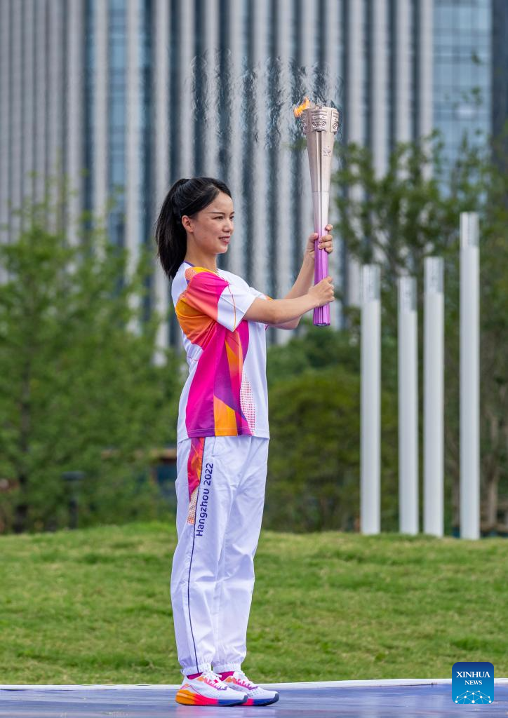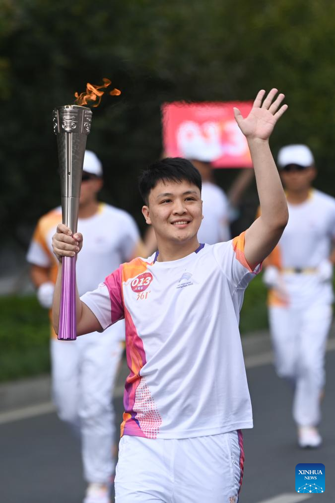 Torch bearer Wei Mengxi holds the torch during during the torch relay of the 19th Asian Games in Taizhou, east China's Zhejiang Province, Sept. 14, 2023. (Xinhua/Sun Fei)