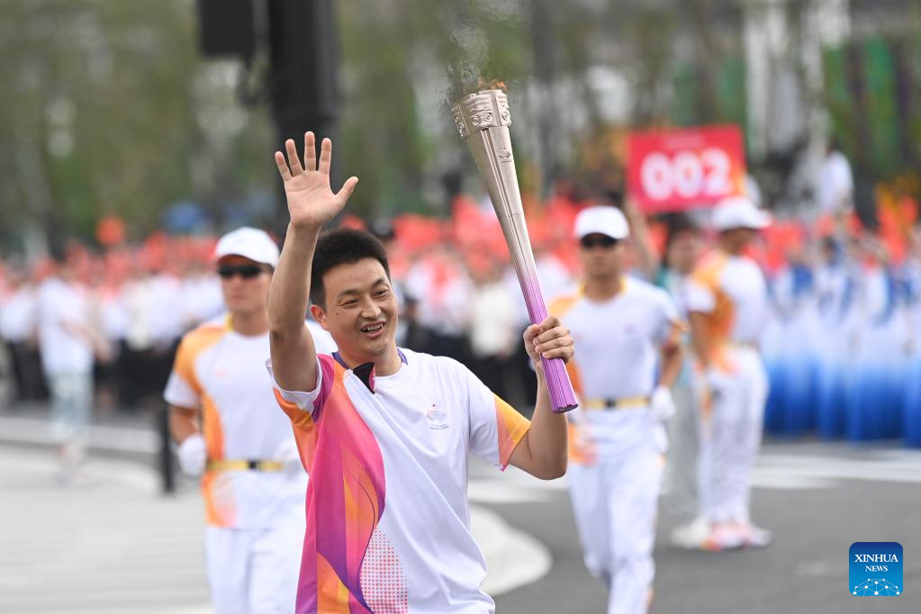 Torch bearer Feng Yu runs with the torch during the torch relay of the 19th Asian Games in Taizhou, east China's Zhejiang Province, Sept. 14, 2023. (Xinhua/Huang Zongzhi)