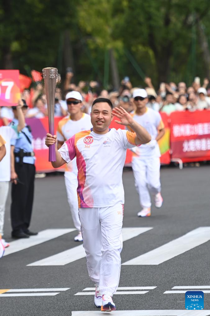 Torch bearer Lu Jingliang runs with the torch during the torch relay of the 19th Asian Games in Taizhou, east China's Zhejiang Province, Sept. 14, 2023. (Xinhua/Huang Zongzhi)