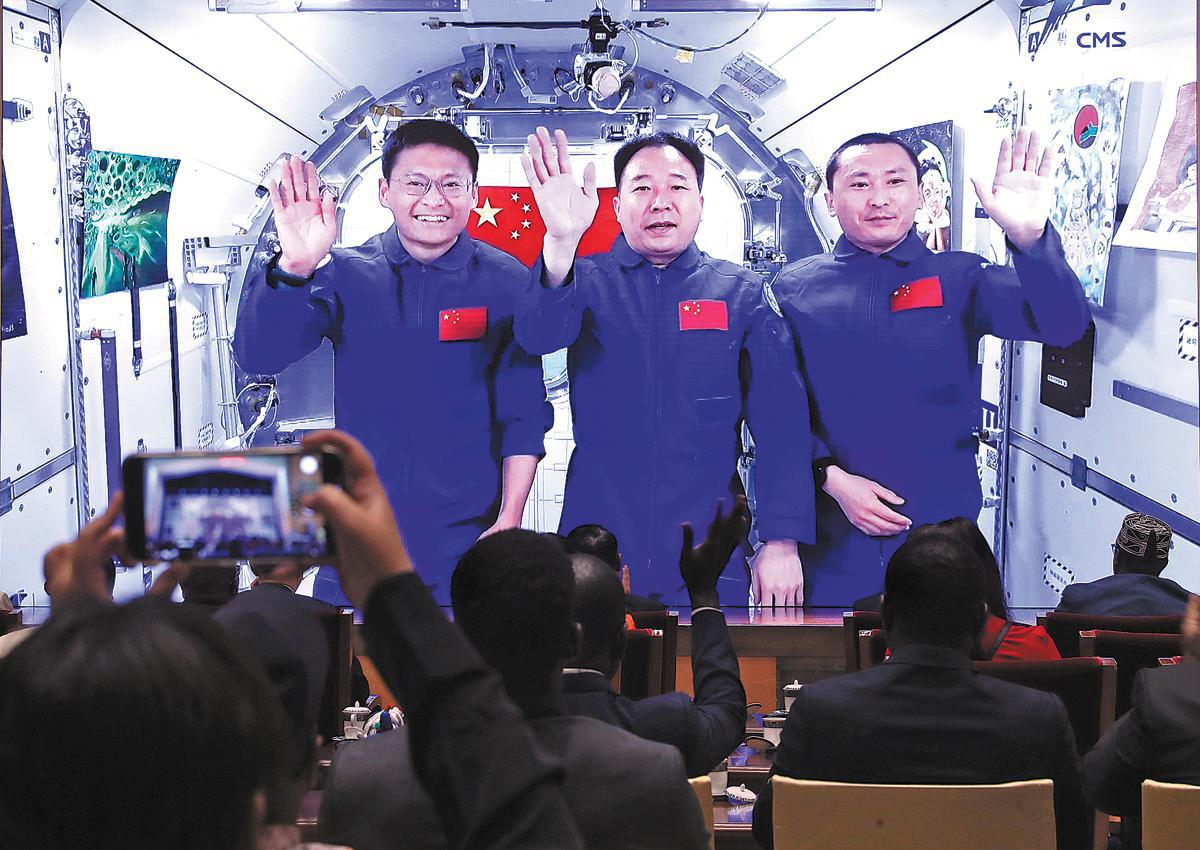 Chinese astronauts Jing Haipeng (center), Zhu Yangzhu (right) and Gui Haichao introduce 10 award-winning paintings, created by African youths, to an audience in Beijing via video link on Wednesday from the Tiangong space station. Zou Hong / China Daily