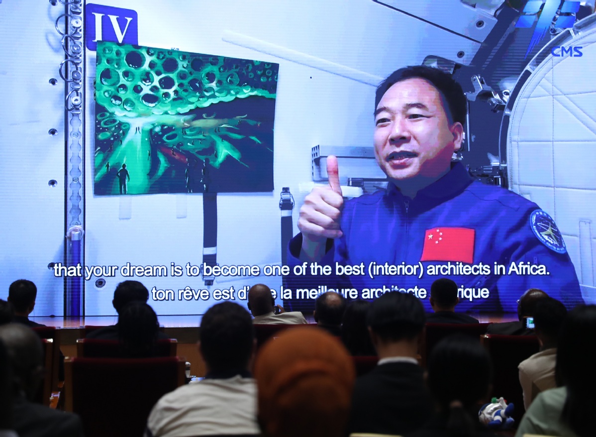 Chinese astronaut Jing Haipeng introduces award-winning paintings, created by African youths, to audience in Beijing via video link on Wednesday from the Tiangong space station. Zou Hong / China Daily