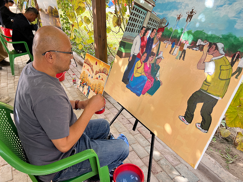 A farmer painter creates a Daolang-style painting in northwest China's Xinjiang Uygur Autonomous Region. (People's Daily Online/Chang Xuemei)