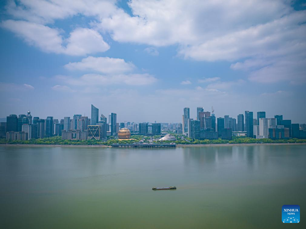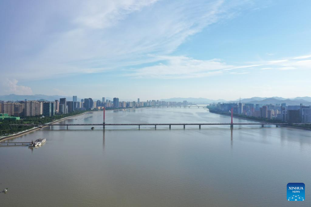 This aerial photo taken on June 28, 2023 shows the Qiantang River in Hangzhou, east China's Zhejiang Province. (Xinhua/Huang Zongzhi)