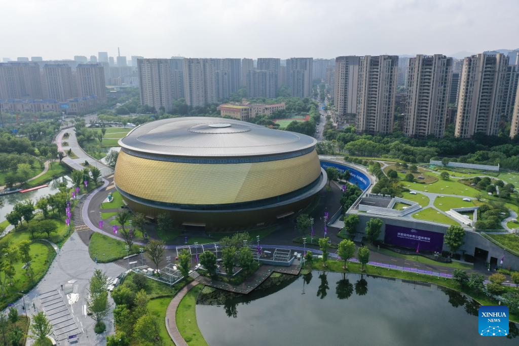 This aerial photo taken on Aug. 21, 2023 shows the Huanglong Sports Center in Hangzhou, east China's Zhejiang Province. (Xinhua/Huang Zongzhi)