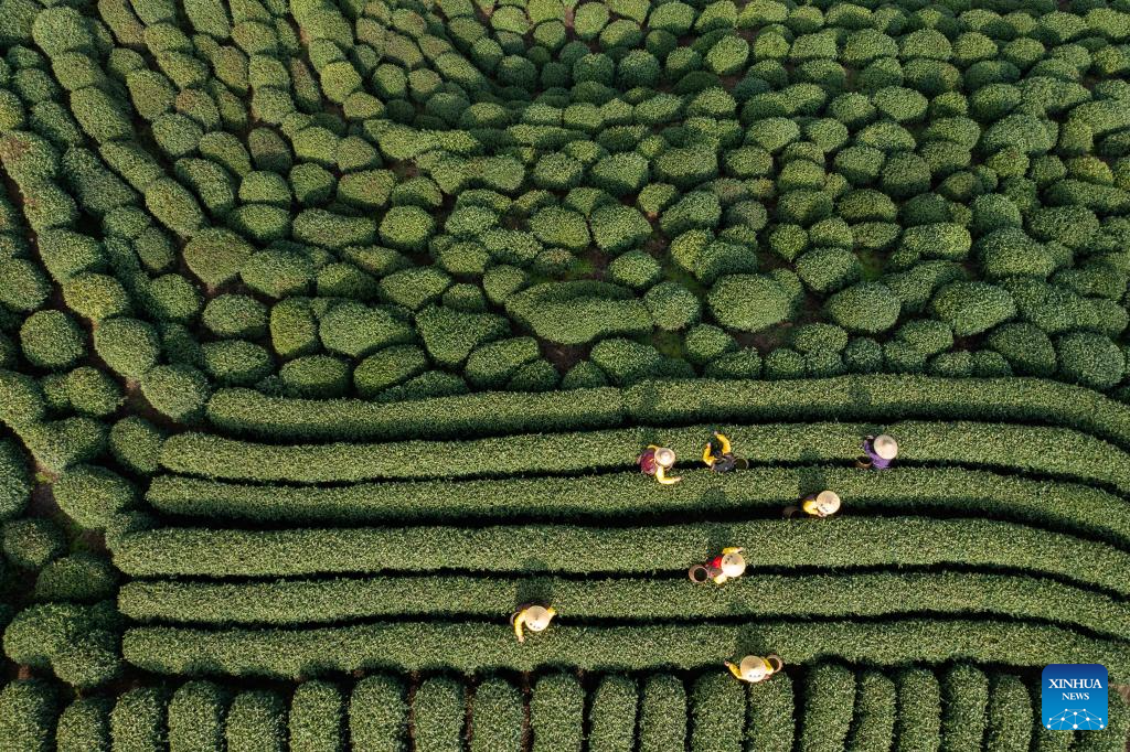 This aerial photo taken on March 13, 2023 shows farmers picking tea leaves at a tea garden in Hangzhou, east China's Zhejiang Province. (Xinhua/Xu Yu)