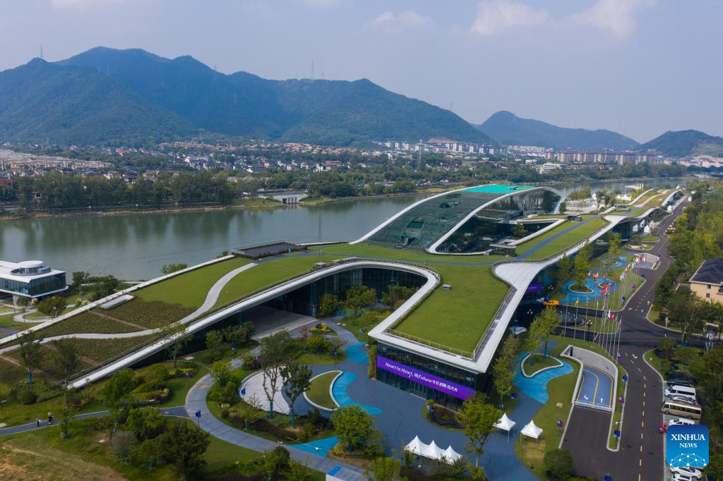 This aerial photo taken on Aug. 23, 2023 shows the Gongshu Canal Sports Park Gymnasium in Hangzhou, east China's Zhejiang Province. (Xinhua/Huang Zongzhi)