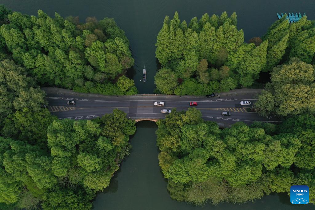 This aerial photo taken on May 3, 2023 shows a view of the West Lake scenic area in Hangzhou, east China's Zhejiang Province. (Xinhua/Weng Xinyang)