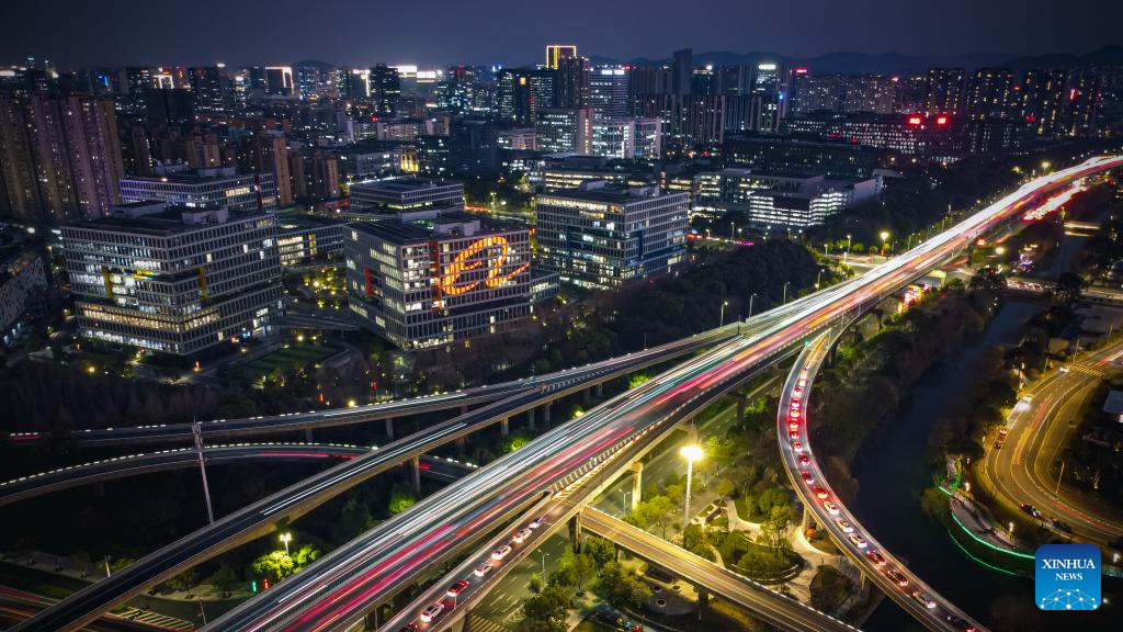 This aerial photo taken on Jan. 29, 2023 shows a night view in Binjiang District of Hangzhou, east China's Zhejiang Province. (Xinhua/Jiang Han)