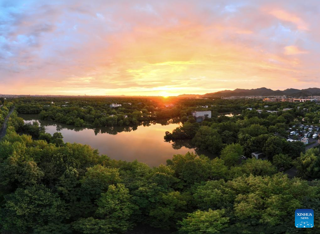 This aerial photo taken on July 31, 2023 shows the Xixi Wetland at sunrise in Hangzhou, east China's Zhejiang Province. (Xinhua/Weng Xinyang)