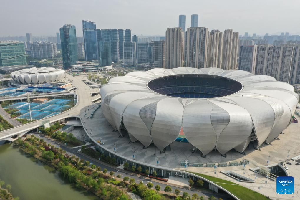 This aerial photo taken on April 26, 2023 shows the Hangzhou Olympic Sports Center in Hangzhou, east China's Zhejiang Province. (Xinhua/Jiang Han)