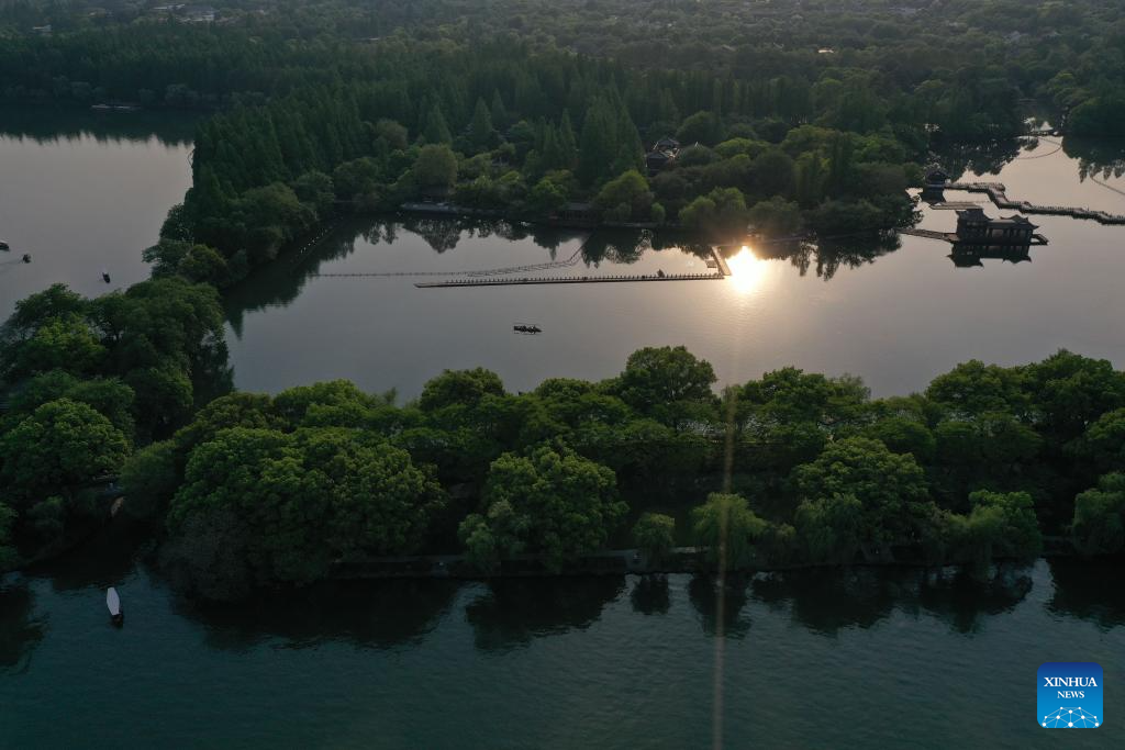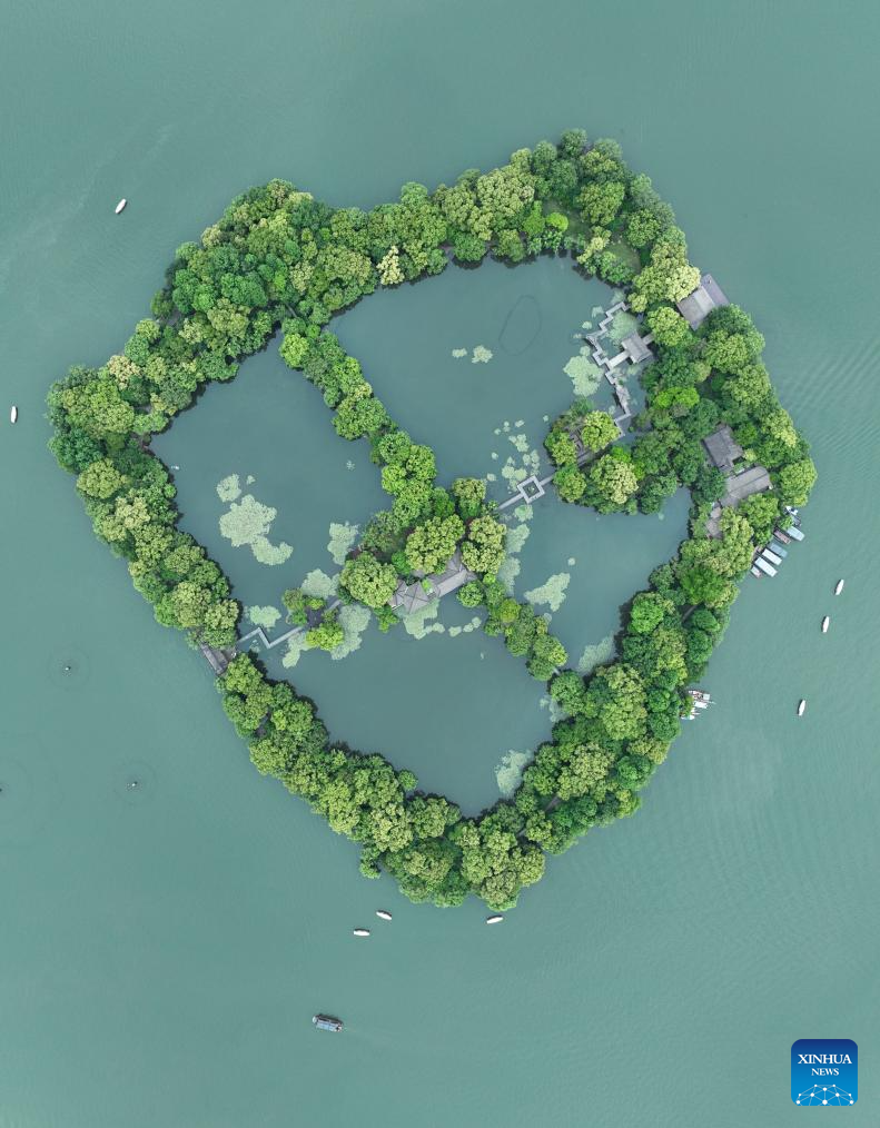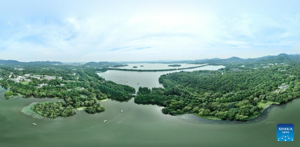 This aerial photo taken on June 11, 2023 shows a view of the West Lake scenic area in Hangzhou, east China's Zhejiang Province. (Xinhua/Weng Xinyang)