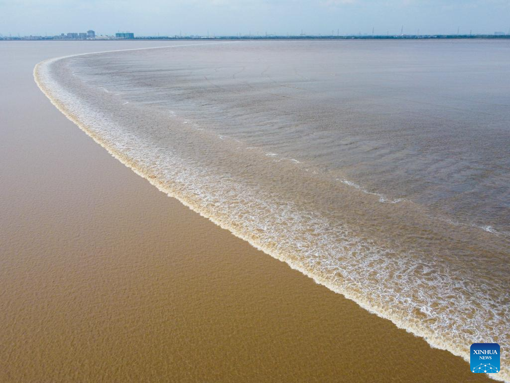 This aerial photo taken on Oct. 5, 2020 shows a view of the tidal bore of the Qiantang River in Hangzhou, east China's Zhejiang Province. (Xinhua/Jiang Han)