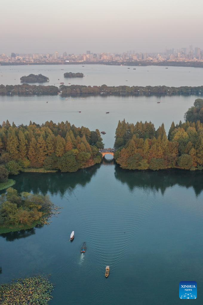 This aerial photo taken on Nov. 6, 2020 shows the West Lake scenic area in Hangzhou, east China's Zhejiang Province. (Xinhua/Huang Zongzhi)