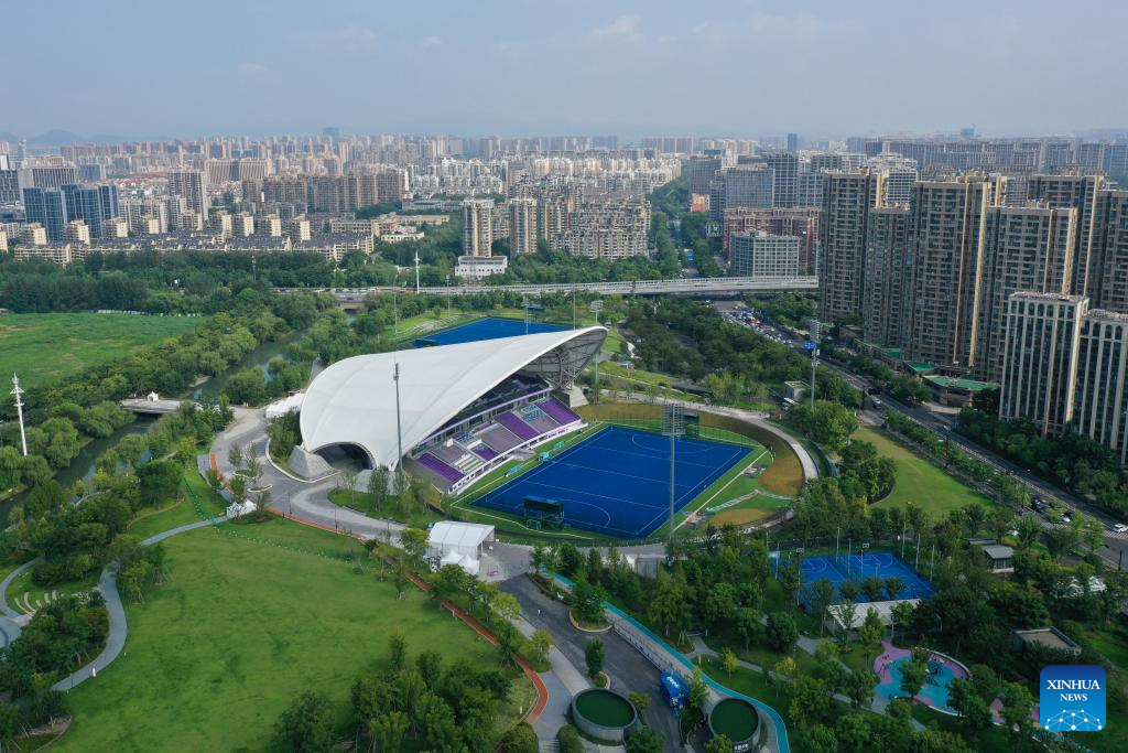 This aerial photo taken on Aug. 23, 2023 shows the Gongshu Canal Sports Park Stadium in Hangzhou, east China's Zhejiang Province. (Xinhua/Huang Zongzhi)