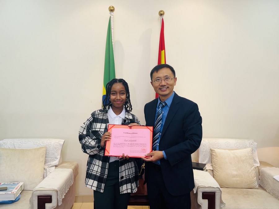 Ethiopian teenager Abigail Berhanemeskel, whose artwork has won the second prize in the "My Dream" painting competition for African youth, holds a certificate of honor while posing with Shen Qinmin, the minister counselor at the Chinese Embassy in Ethiopia, in Addis Ababa, Ethiopia, on June 8, 2023. (Chinese Embassy in Ethiopia/Handout via Xinhua)