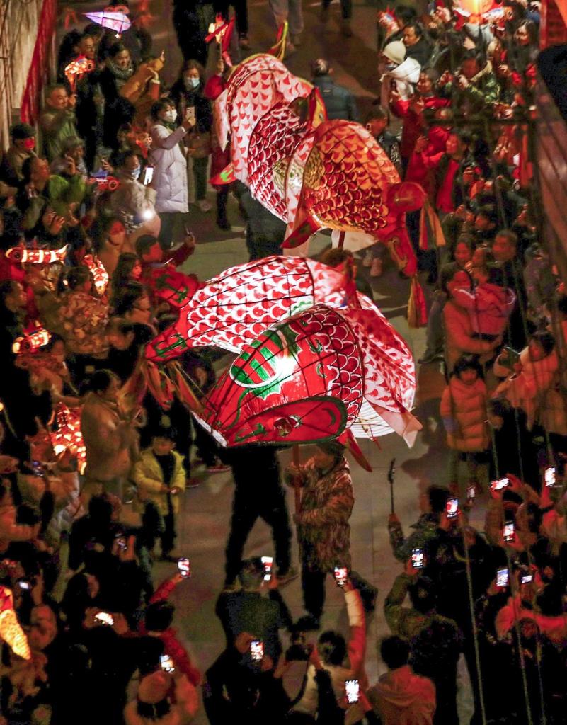 People holding fish-shaped lanterns parade during the Chinese New Year celebrations in Shexian County of Huangshan City, east China's Anhui Province, Jan. 31, 2023. (Xinhua/Du Yu)
