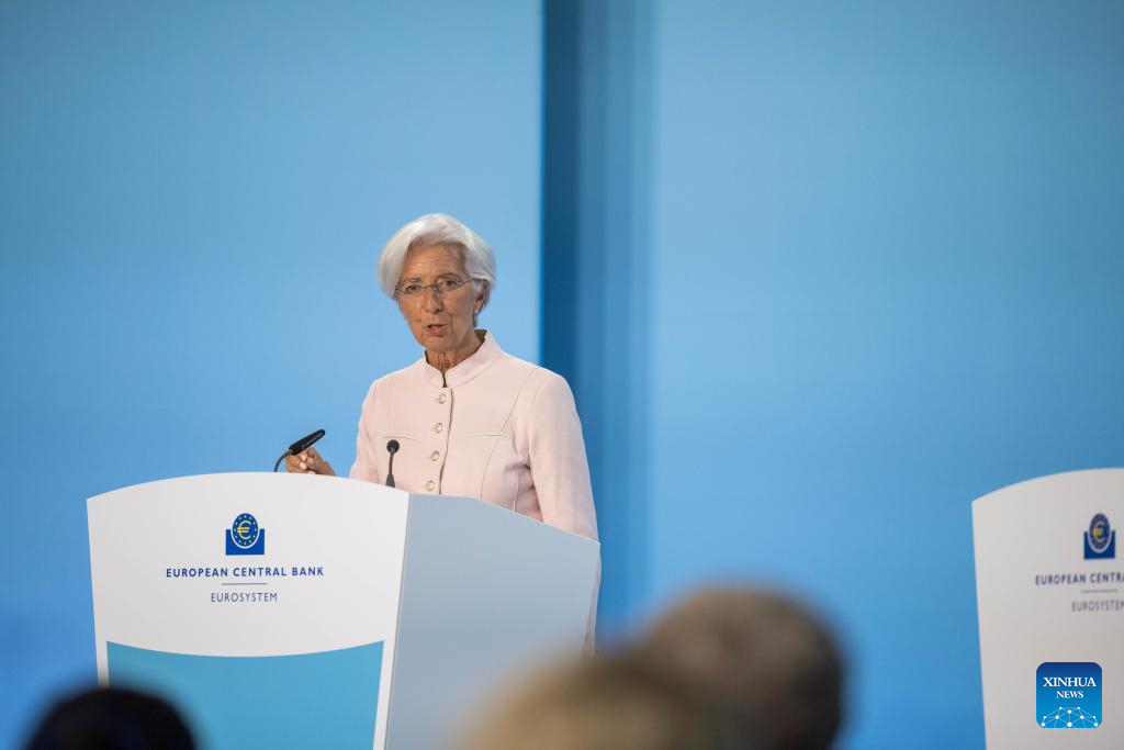 European Central Bank (ECB) President Christine Lagarde attends a press conference in Frankfurt, Germany, Sept. 14, 2023. The ECB on Thursday lifted key interest rates by another 0.25 percentage points, putting the rates to all-time high. (ECB/Handout via Xinhua)
