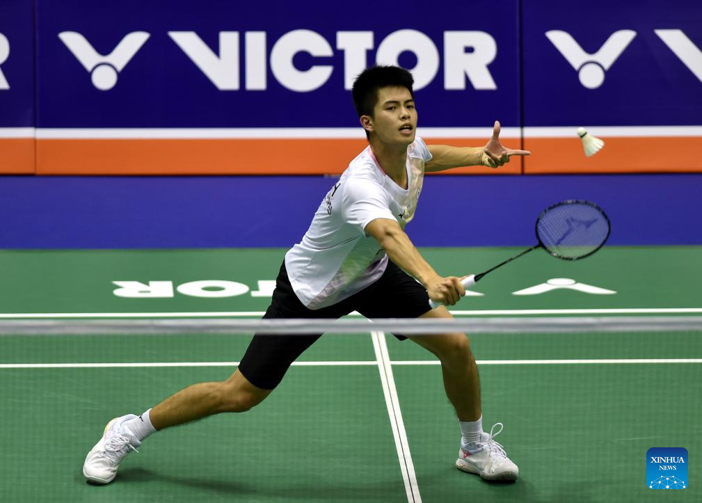 Lee Chia Hao of Chinese Taipei hits a return to Lee Zii Jia of Malaysia during the men's singles second round match at Hong Kong Open 2023 badminton tournament in south China's Hong Kong, Sept. 14, 2023. (Xinhua/Lo Ping Fai)