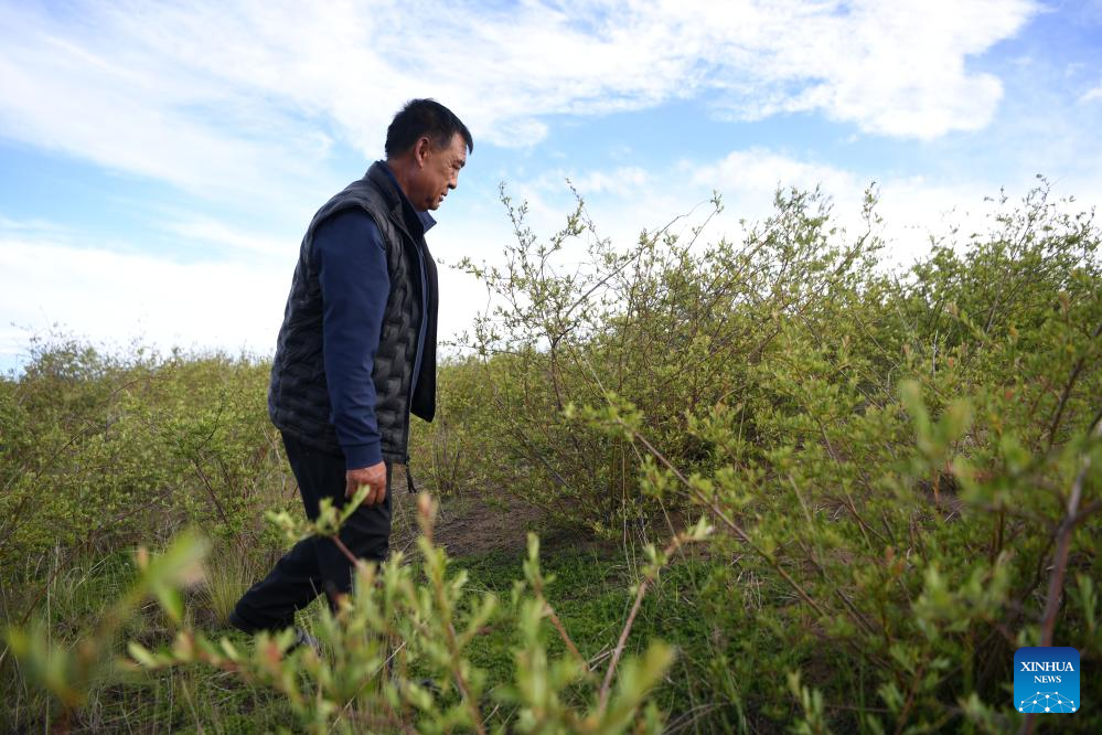 Villager Zhoima Gyaibo checks the growth of plants at a grassland management point along the Yellow River in Maqu County, Gannan Tibetan Autonomous Prefecture, northwest China's Gansu Province, July 5, 2023.