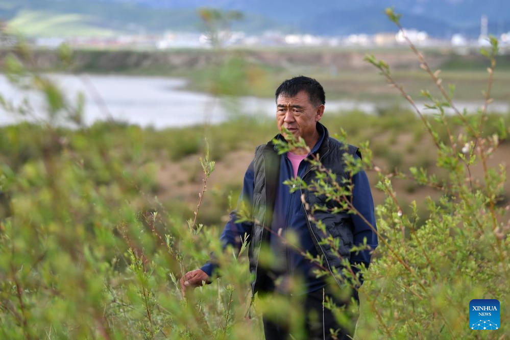 Villager Zhoima Gyaibo checks the growth of plants at a grassland management point along the Yellow River in Maqu County, Gannan Tibetan Autonomous Prefecture, northwest China's Gansu Province, July 5, 2023.