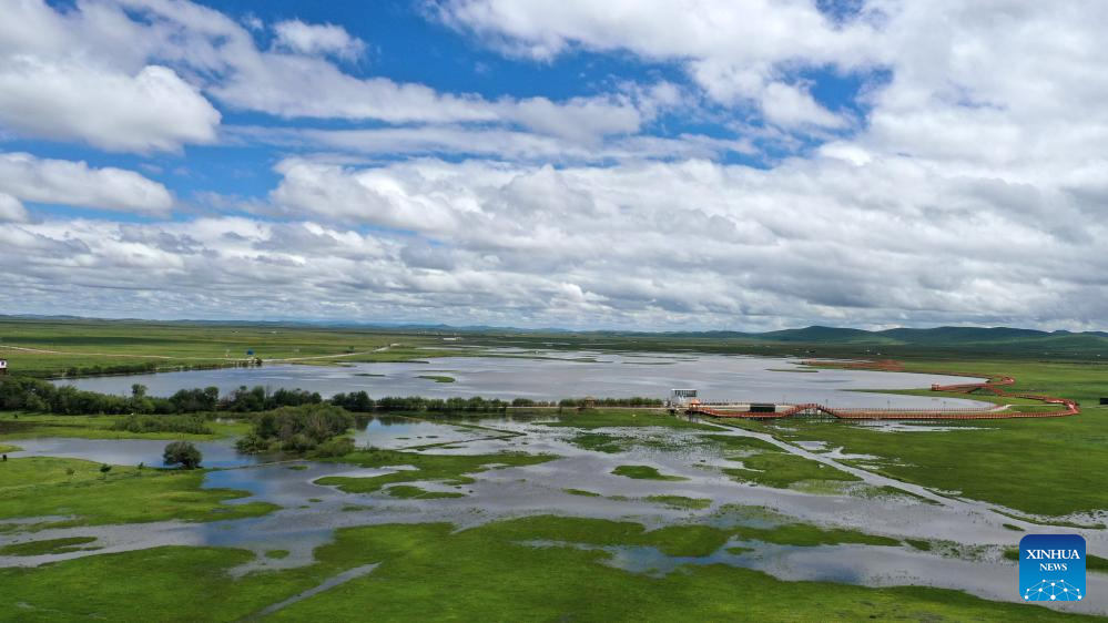 This aerial photo taken on July 5, 2023 shows the wetland at the Hequ horse ranch in Maqu County, Gannan Tibetan Autonomous Prefecture of northwest China's Gansu Province.