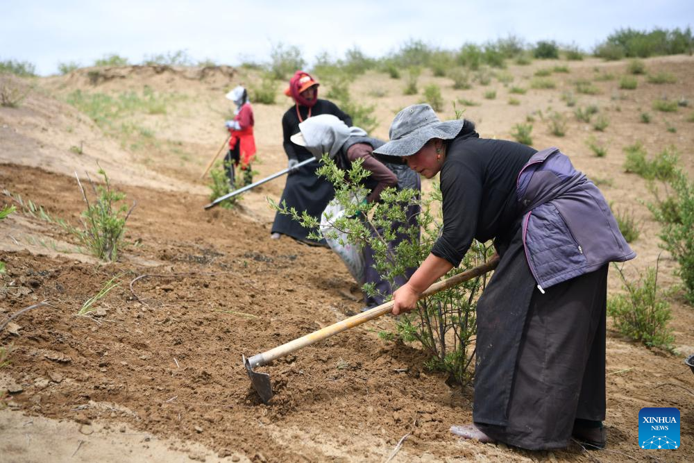 Villagers sow grass seeds on a grassland management point along the Yellow River in Oula Town of Maqu County, Gannan Tibetan Autonomous Prefecture, northwest China's Gansu Province, July 6, 2023.