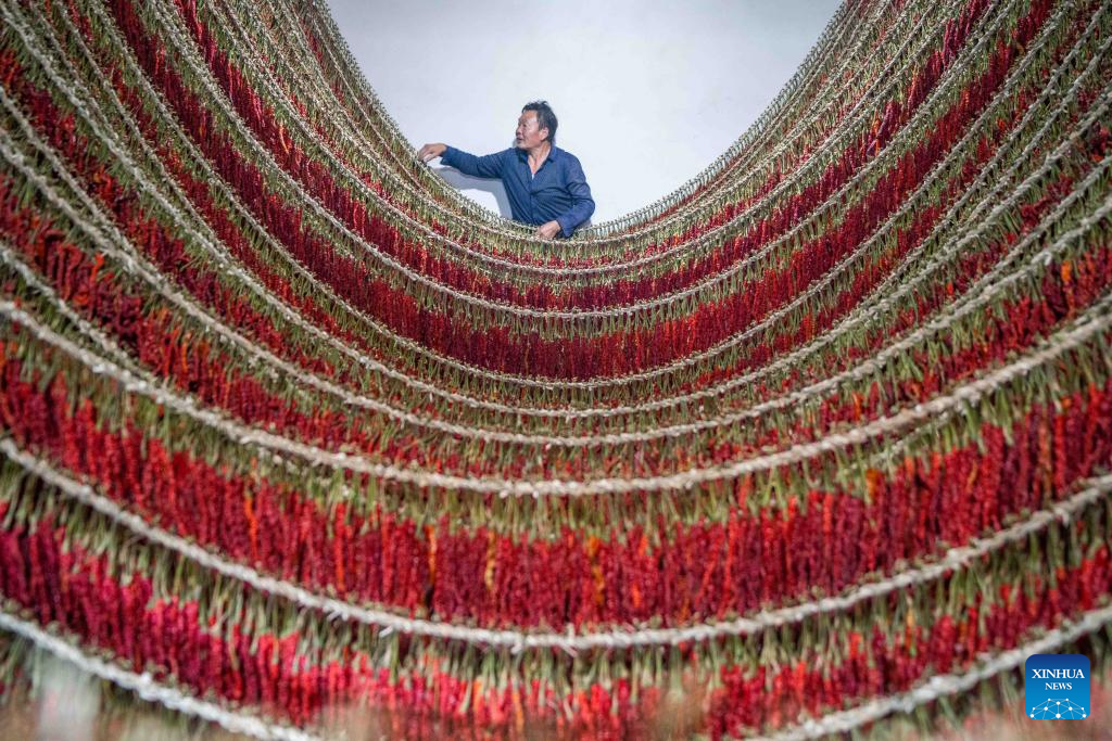 A villager checks hot peppers being dried in Jinji Village of Dafang County, southwest China's Guizhou Province, Sept. 13, 2023. (Photo by Luo Dafu/Xinhua)