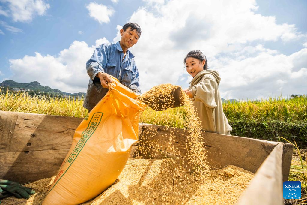 Villagers collect rice in Dafang County of Bijie, southwest China's Guizhou Province, Sept. 14, 2023. (Photo by Luo Dafu/Xinhua)