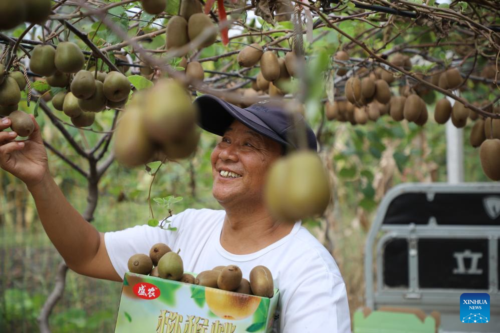 A farmer picks kiwi fruits at an orchard in Shizhuang Village of Zhumadian, central China's Henan Province, Sept. 14, 2023. (Photo by Mi Shan/Xinhua)
