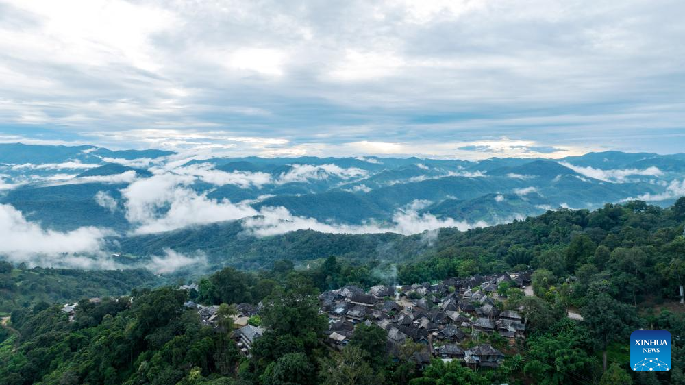 This aerial photo taken on Sept. 17, 2023 shows a traditional village surrounded by forests and tea gardens in Jingmai Mountain in Pu'er, southwest China's Yunnan Province. (Xinhua/Hu Chao)