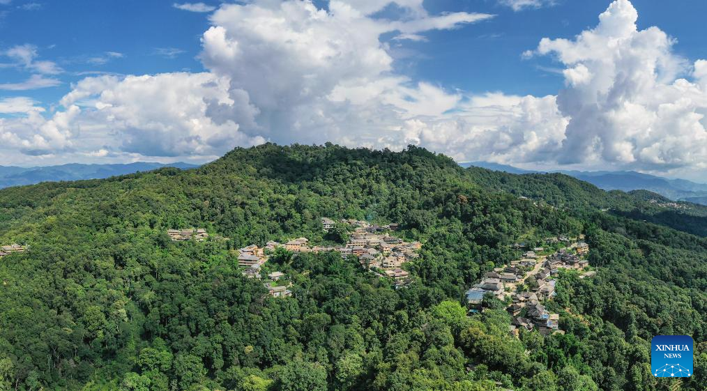 This aerial photo taken on Aug. 29, 2023 shows a traditional village in Jingmai Mountain in Pu'er, southwest China's Yunnan Province. (Xinhua/Li He)