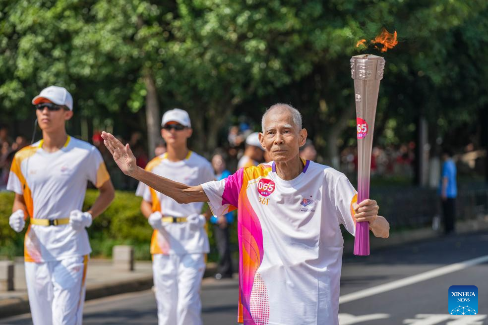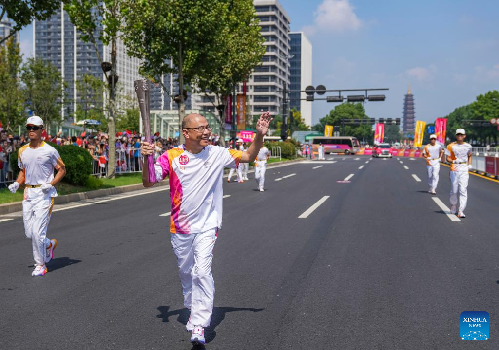 Torch bearer Lou Renbin runs with the torch during the torch relay of the 19th Asian Games in Jinhua, east China's Zhejiang Province, Sept. 17, 2023. (Xinhua/Sun Fei)