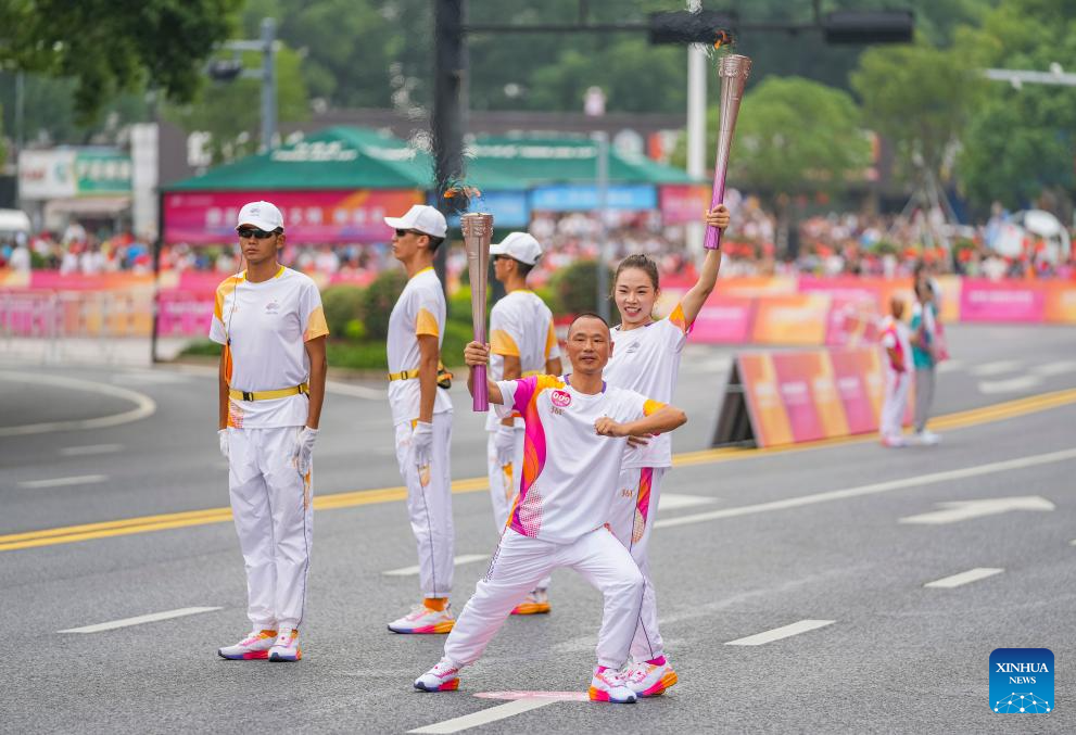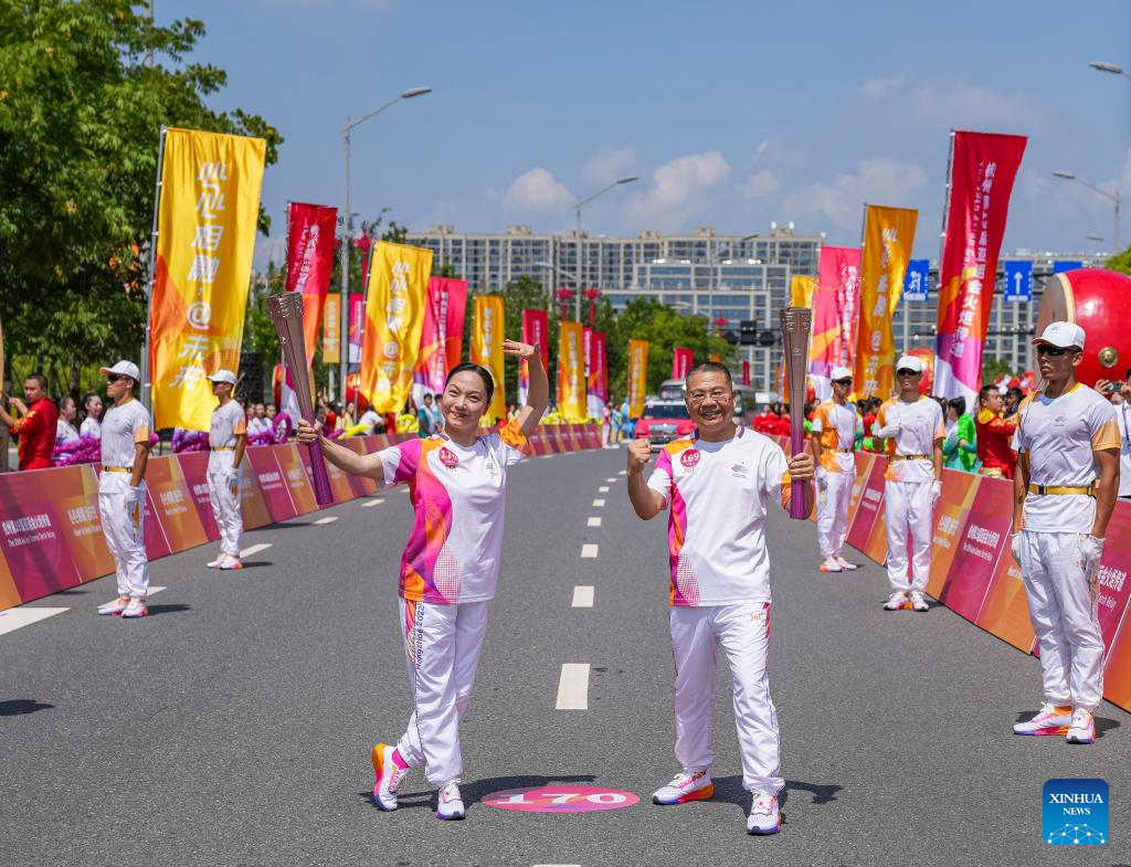 Torch bearers Qian Chun (R) and Shi Xiaodong pose during the torch relay of the 19th Asian Games in Jinhua, east China's Zhejiang Province, Sept. 17, 2023. (Xinhua/Sun Fei)