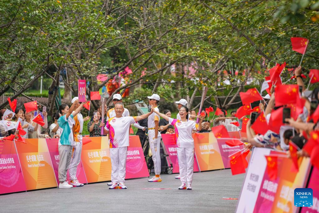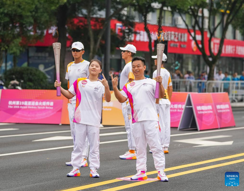 Torch bearers Zhou Pingen (L) and Xu Min during the torch relay of the 19th Asian Games in Jinhua, east China's Zhejiang Province, Sept. 17, 2023. (Xinhua/Sun Fei)