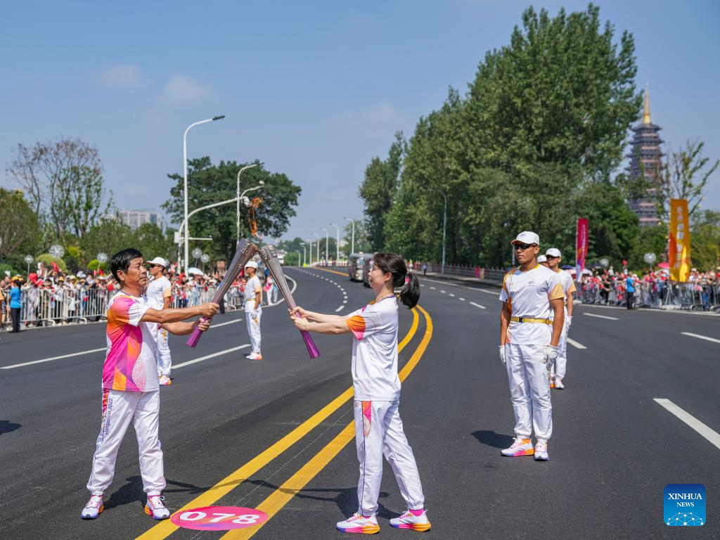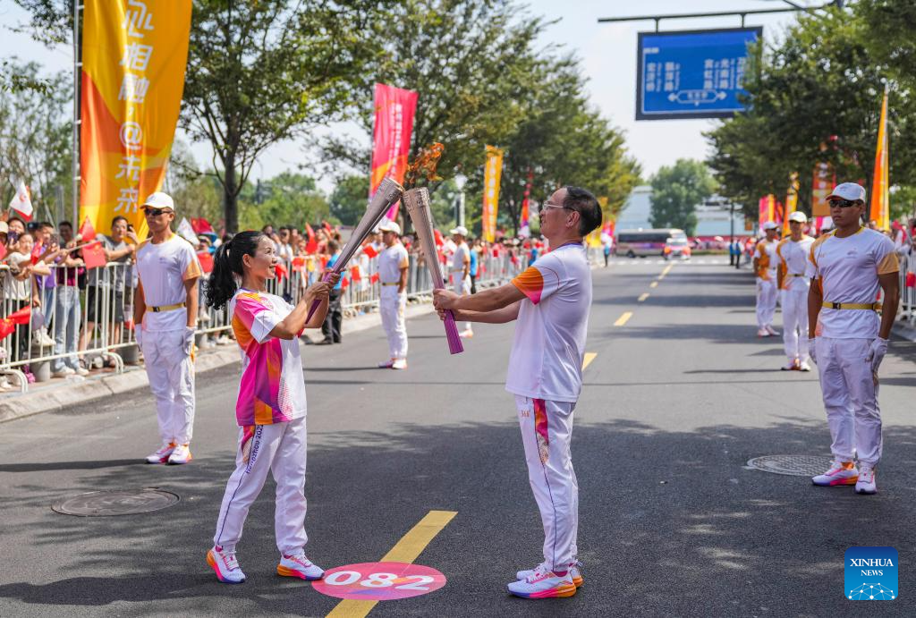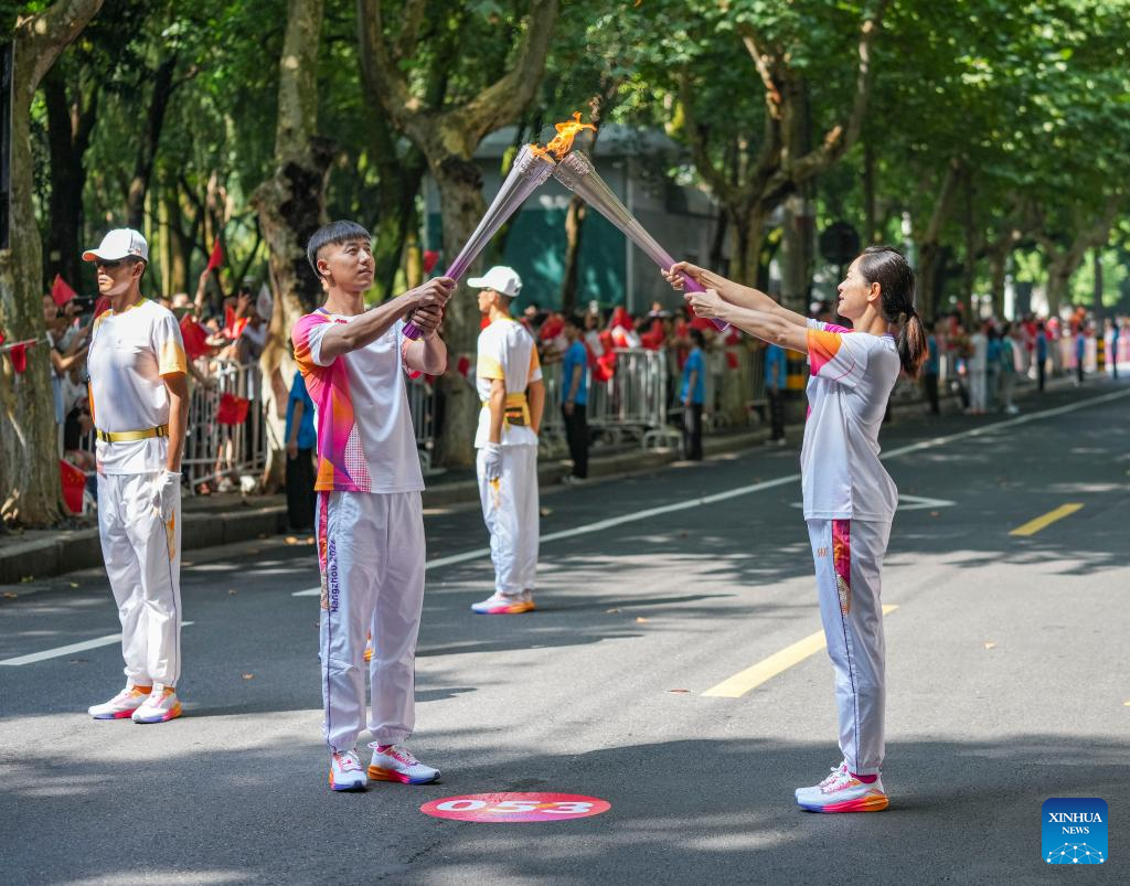 Torch bearers Li Menglin (L) and daijuan pass the flame during the torch relay of the 19th Asian Games in Jinhua, east China's Zhejiang Province, Sept. 17, 2023. (Xinhua/Sun Fei)