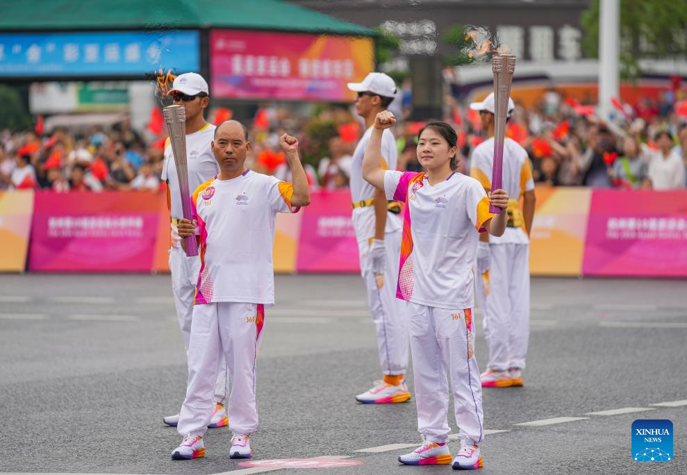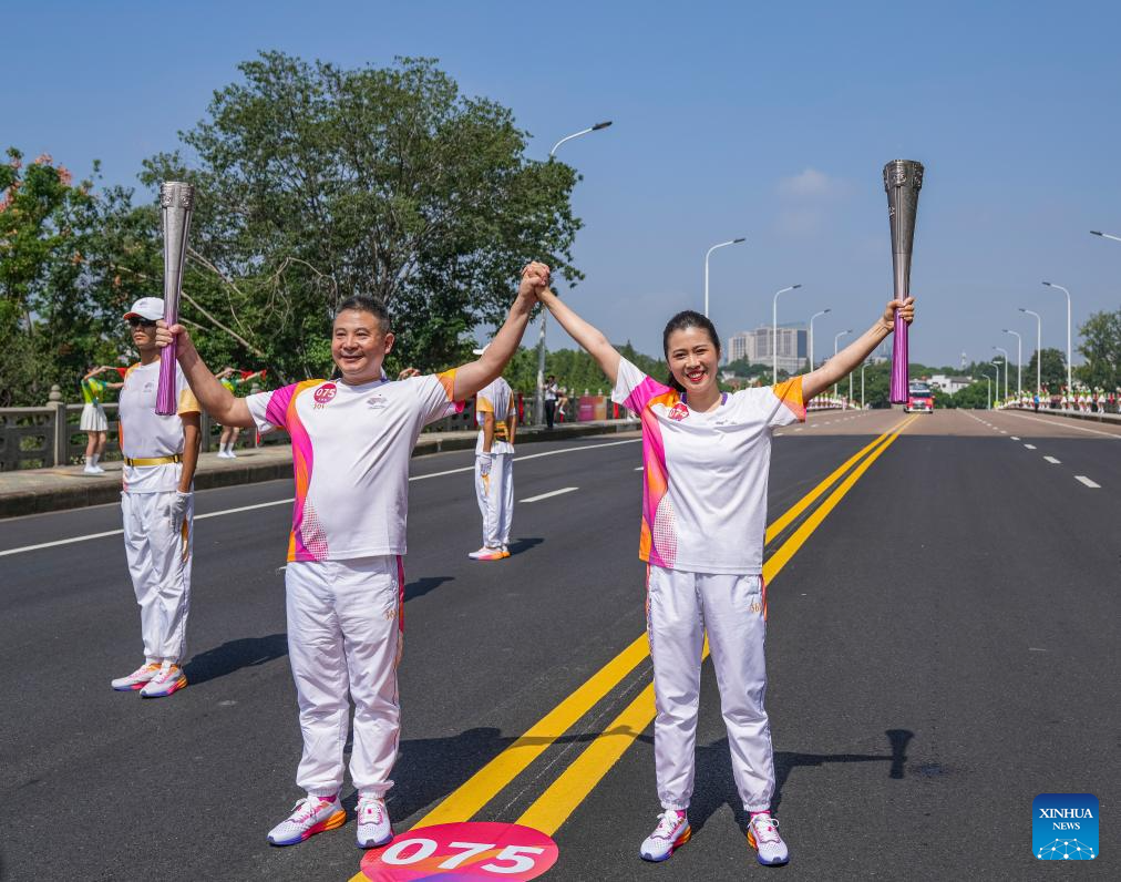Torch bearers Weng Ying (Top) and Lou Sheng pose during the torch relay of the 19th Asian Games in Jinhua, east China's Zhejiang Province, Sept. 17, 2023. (Xinhua/Sun Fei)