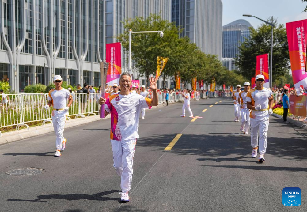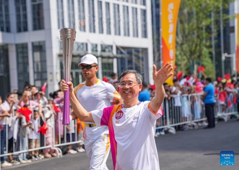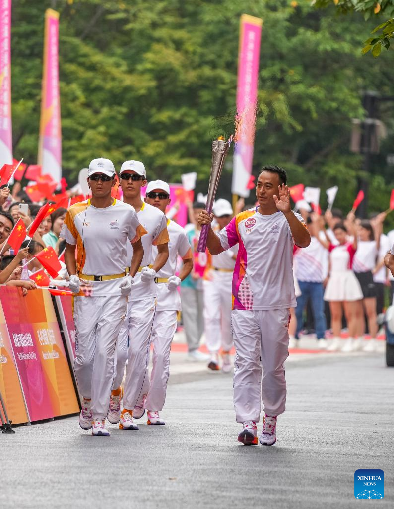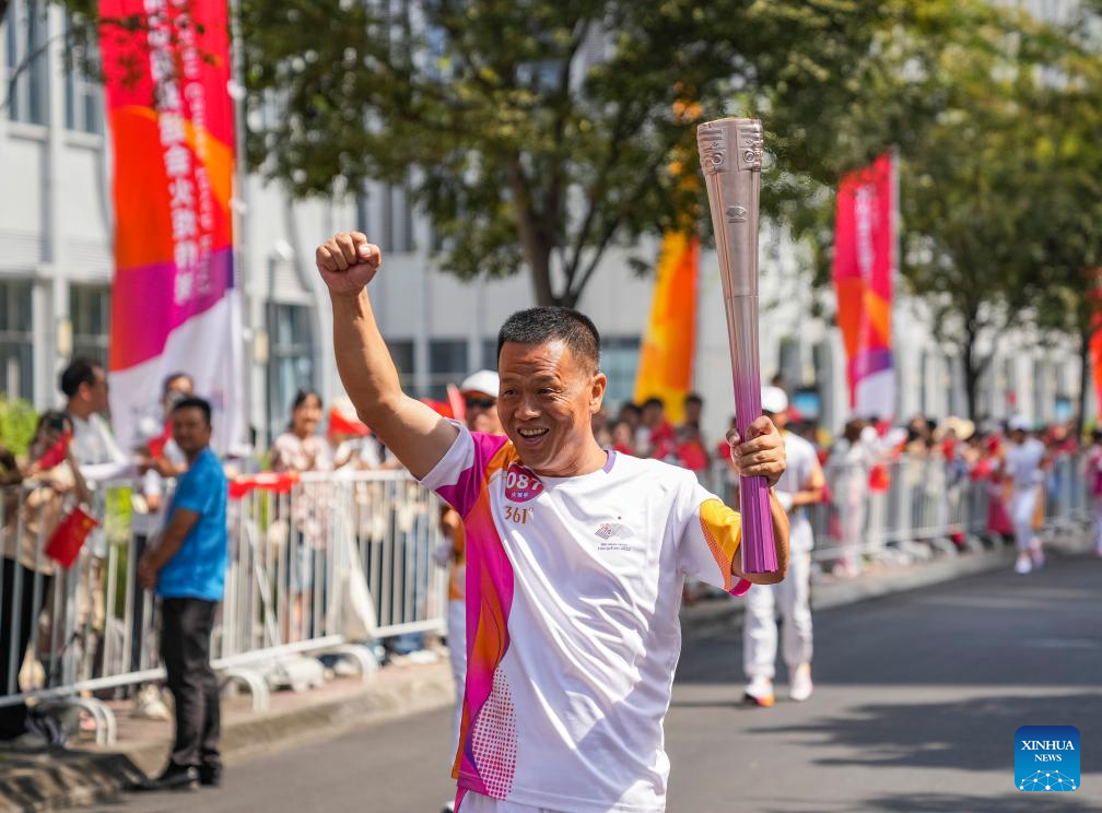 Torch bearer Tong Kaijun runs with the torch during the torch relay of the 19th Asian Games in Jinhua, east China's Zhejiang Province, Sept. 17, 2023. (Xinhua/Sun Fei)
