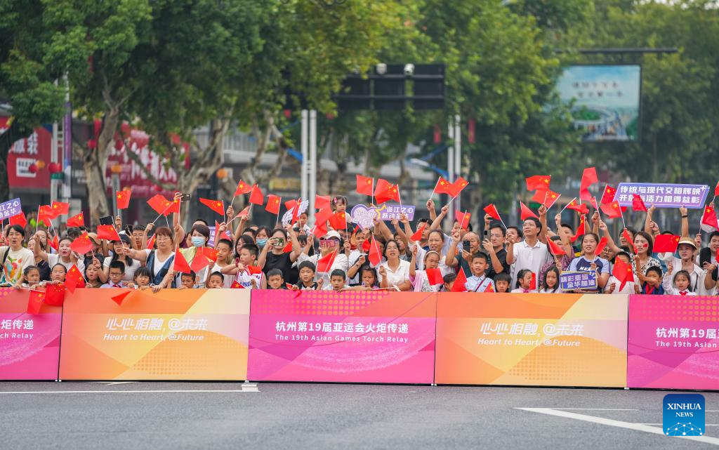 People watch the torch relay of the 19th Asian Games in Jinhua, east China's Zhejiang Province, Sept. 17, 2023. (Xinhua/Sun Fei)