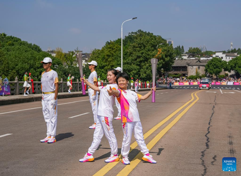 Torch bearers Qian Hongfang (R) and Chen Luofan pose during the torch relay of the 19th Asian Games in Jinhua, east China's Zhejiang Province, Sept. 17, 2023. (Xinhua/Sun Fei)