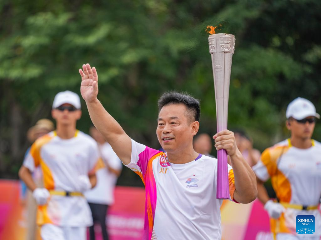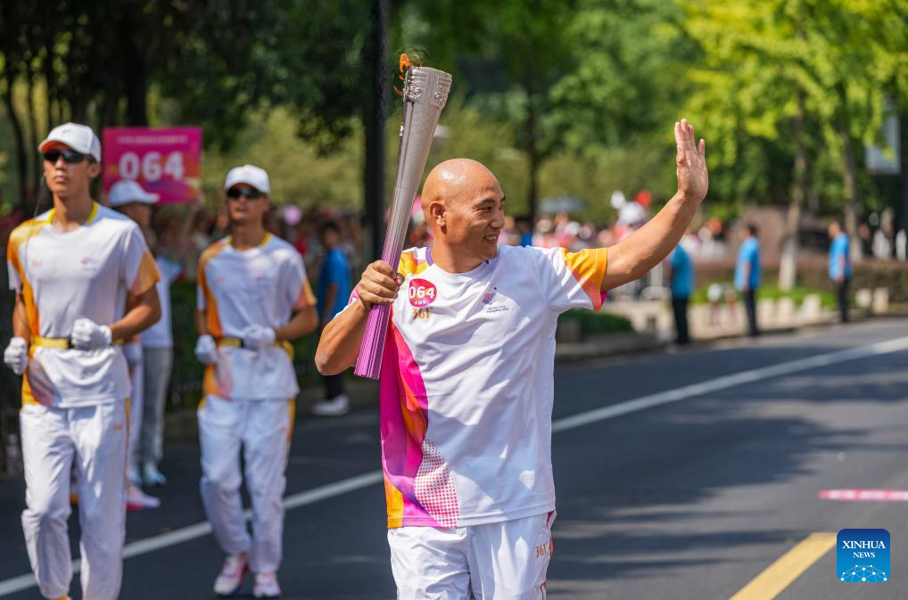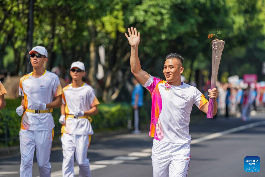 Torch bearer Lin Bin runs with the torch during the torch relay of the 19th Asian Games in Jinhua, east China's Zhejiang Province, Sept. 17, 2023. (Xinhua/Sun Fei)